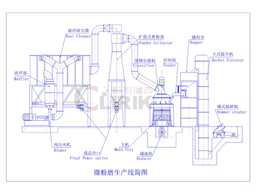 超細磨粉機全套配置包括錘式破碎機、斗式提升機、儲料倉、震動給料機、磨粉機主機、變頻分級機、雙聯旋風集粉器、脈沖除塵系統、高壓風機、空氣壓縮機、電器控制系統。
