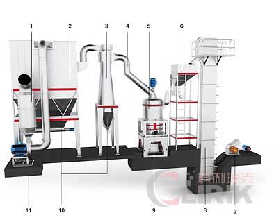 HGM超細(xì)磨粉機(jī)全套配置包括破碎機(jī)、斗式提升機(jī)、儲(chǔ)料倉(cāng)、振動(dòng)給料機(jī)、磨粉設(shè)備主機(jī)、變頻分級(jí)機(jī)、雙聯(lián)旋風(fēng)集粉器、脈沖除塵系統(tǒng)、高壓風(fēng)機(jī)、空氣壓縮機(jī)、電器控制系統(tǒng)。